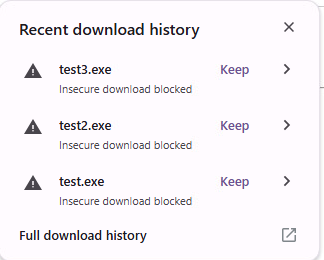 If we attempt to download our executables, we are first blocked by the browser, which warns us that we are attempting an insecure download. After clicking “keep”, Microsoft Defender and Google Chrome both alert us that the download contains a virus.