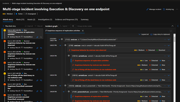 Clicking on the incident reveals the Attack story, Alerts, and additional information. Within the attack story, each item shows the Incident graph, which lays out the timeline of each command and process executed, as well as ratings of severity and suspected malicious activity.
