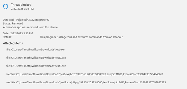 Microsoft defender certainly did its job well by detecting the malicious file and cleaning it up. What if we wanted to see something a bit more interesting, like an actual attach chain in progress? We want to test our sensors to see if Microsoft Defender can adequately detect things like recon, enumeration, privilege escalation, and spawning of processes.