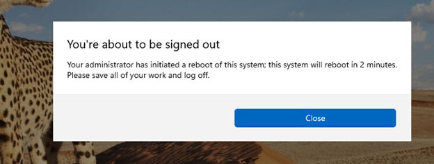 After approving the remediation plan, the listed files are deleted, and a signal is sent to automatically reboot the host. On the endpoint, after a few minutes, a message is displayed to the user that a system reboot is imminent.