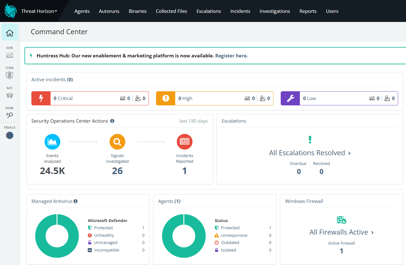 Lets see how Huntress logged our Microsoft Defender incident. When we log into the Huntress Command Center, we are greeted by a clean dashboard that provides some overall statistics about our environment.