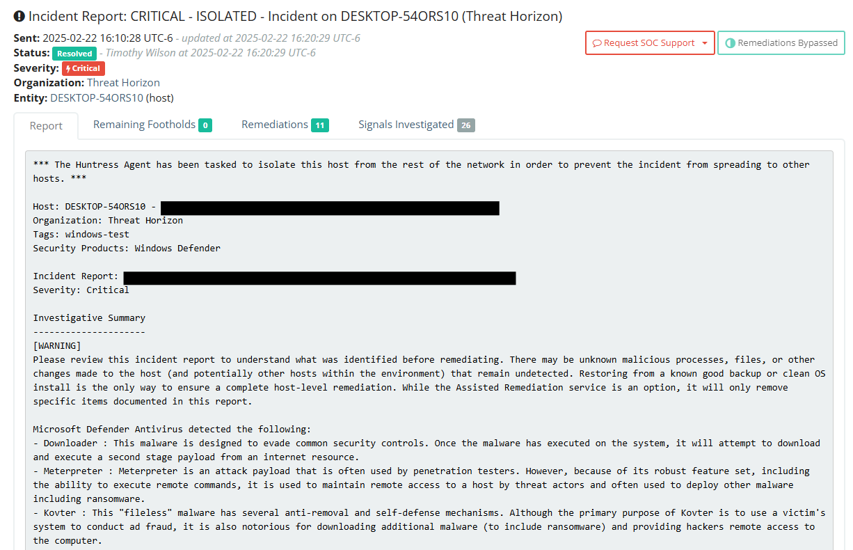 As you can see, we have one active incident being reported. If we click on the incident, and then “view” on the endpoint incident, we are presented with a detailed Incident Report with a concise summary of the incident, remaining footholds, remediations, and the signals investigated.